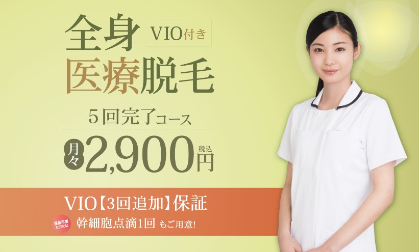 | 全身脱毛5回コース(VIO付き)(全身+VIO) | 3,900円(税込) 5回 総額:308,000円 |