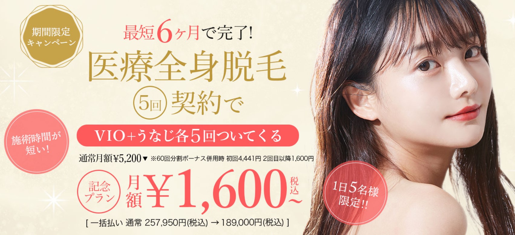 | 全身脱毛プラン(全顔・VIOなし) | 3,960円(税込) 5回 総額:159,500円 |
