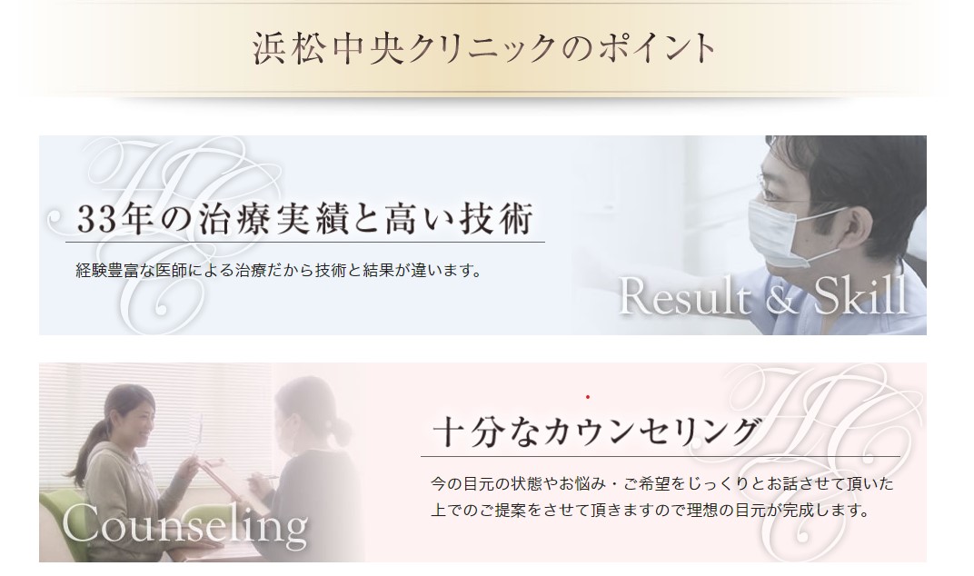 浜松中央クリニックでは、二重整形手術に十分なカウンセリングに加え、キャンペーン料金があります。埋没法は通常137,500円(税込)ですが、58,300円(税込)OFFの79,200円(税込)施術可能です。