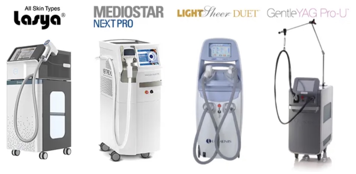 4種類の脱毛機によって、体の部位ごとに機器を切り替え、効率的に照射できるので、1回の来院で全身を照射することが可能となっています。