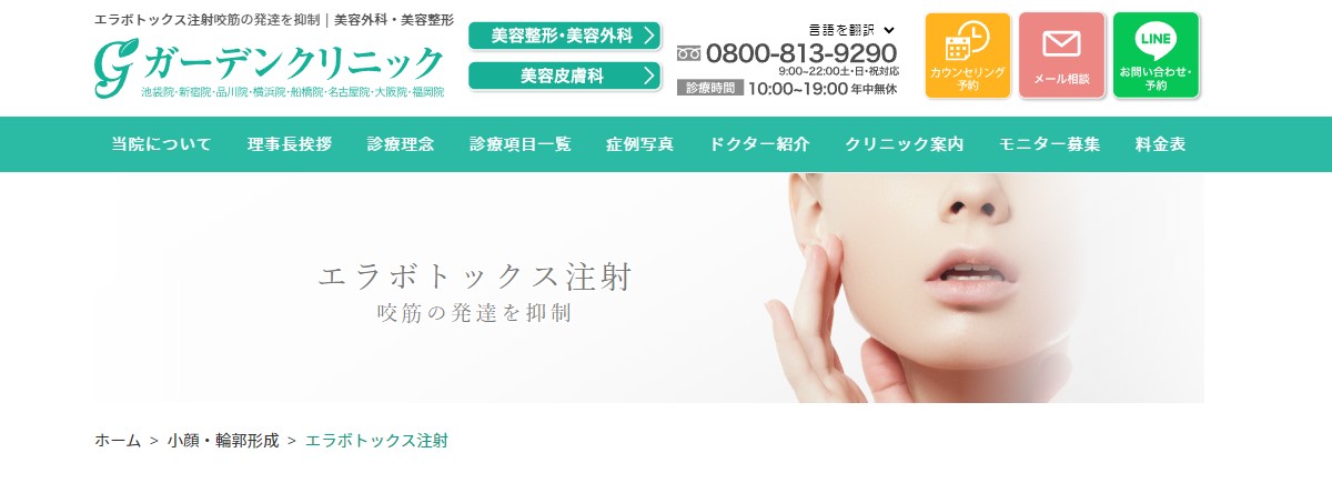 [box class=”box5″]ガーデンクリニック品川院のエラボトックスは数分で終わり、4〜6ヶ月持続するお手軽な施術です。効果がなくなる頃にもう一度追加すれば、小顔効果も継続できます。元に戻りにくいので患者からも評判の良いクリニックですよ![/box]