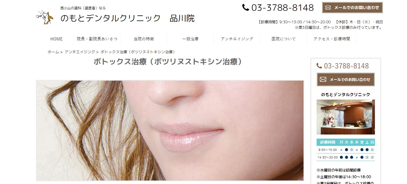 [box class=”box5″]のもとデンタルクリニック品川院は歯科医院ですが、歯の食いしばりによってエラが発達してしまった人にエラボトックスを行なっています。歯医医院にボツリヌストキシン治療もできるのは嬉しいですよね。咬筋の緊張を和らげてくれます。[/box]