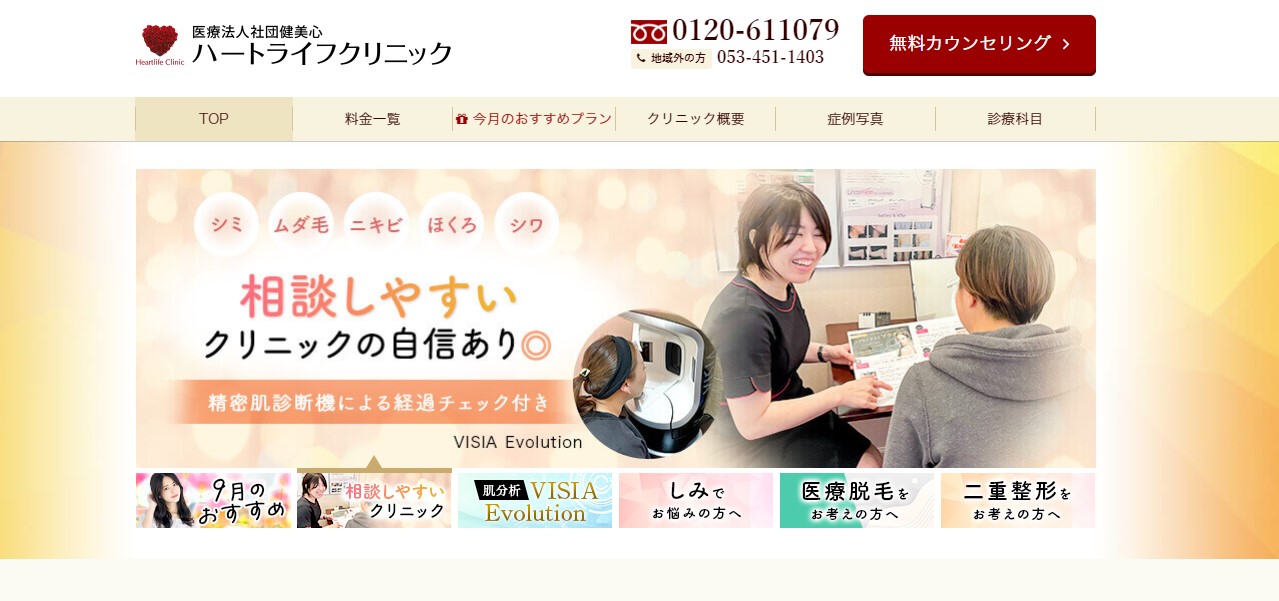 浜松中央クリニックのクマ取り治療は、14,300円(税込)から可能です。ベーシックなヒアルロン酸注入で、クマ取り治療の入り口がくぐりやすくなっています。