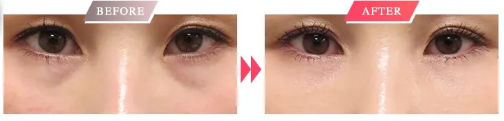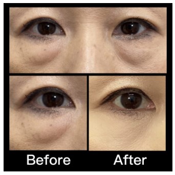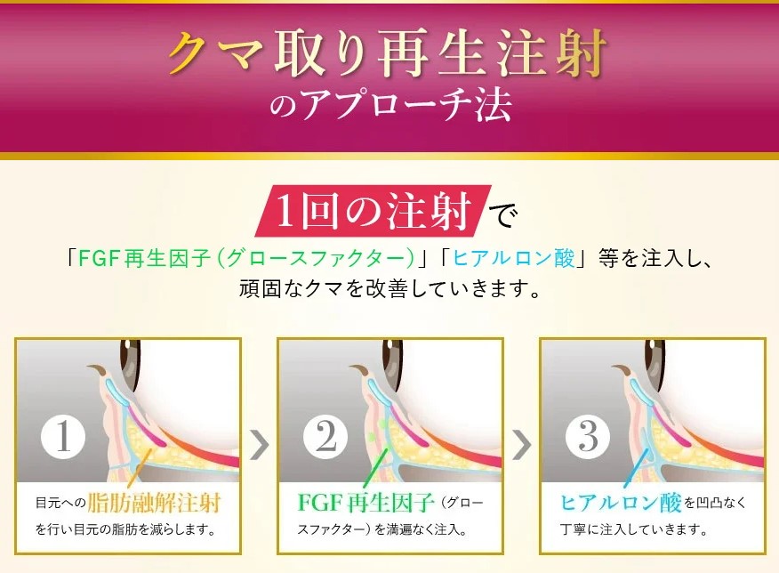 施術の説明:1回の注射で脂肪溶解、再生因子、ヒアルロン酸成分を注入し、目の下のクマを改善します。