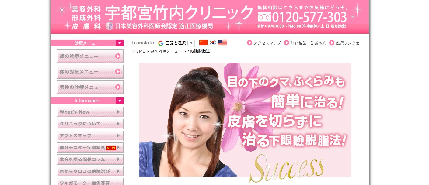 同クリニックはレーザー治療20年以上の実績があるエキスパートです。具体的には、下まぶたにレーザーでアプローチすることで脂肪を除去します。1週間程度のダウンタイムが生じるものの、傷はほとんど見られないのです。