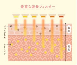 レーザー光を気になる部分に照射し、健康な肌へのダメージを抑えてメラニン色素の部分に作用させます。QスイッチYAGレーザーは、532nmと1064nmの2種類の波長を使い分けることができます。