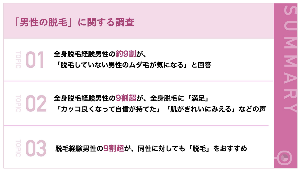 男性の9割がムダ毛が気になると回答。そのうち全身脱毛をして良かったが大半を占めています。また、女性から見ても、ムダ毛のない男性は清潔感があり、好印象のようです。