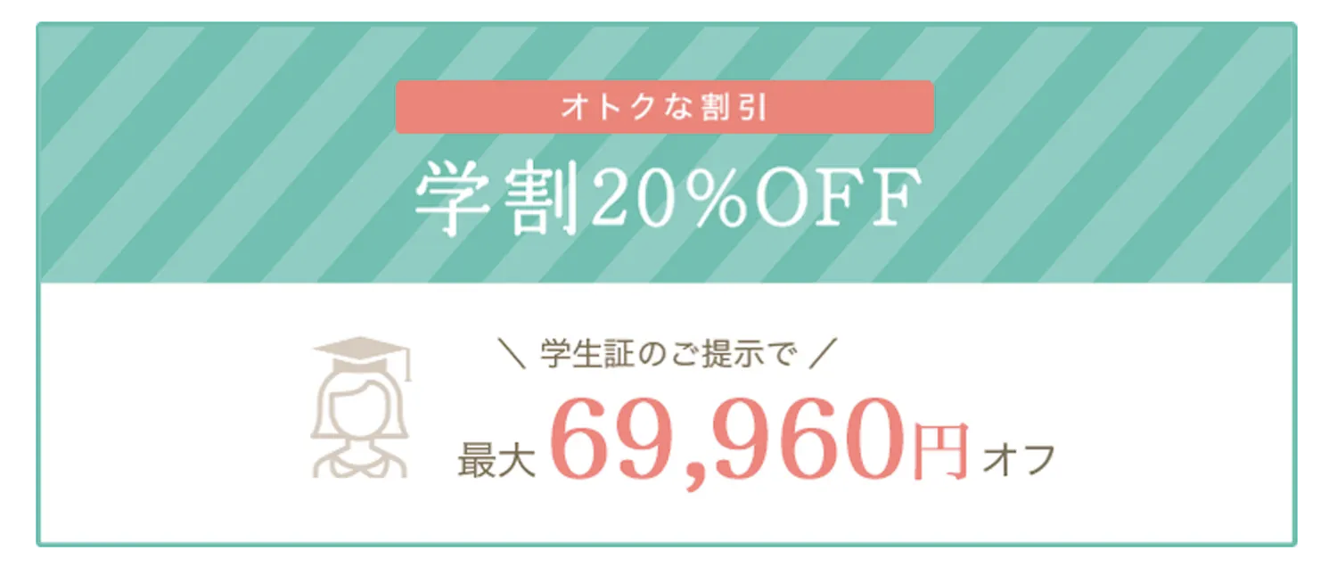 [box class=”box29″ title=”クリニックによって割引が違う”]学割・ペア割などの割引があるかをチェックしましょう。例えば学生さんなら学割が適用されば、卒業した後でも割引が続いてお得になりますよ。通常価格を支払うよりも割引を設定しているクリニックがおすすめです!