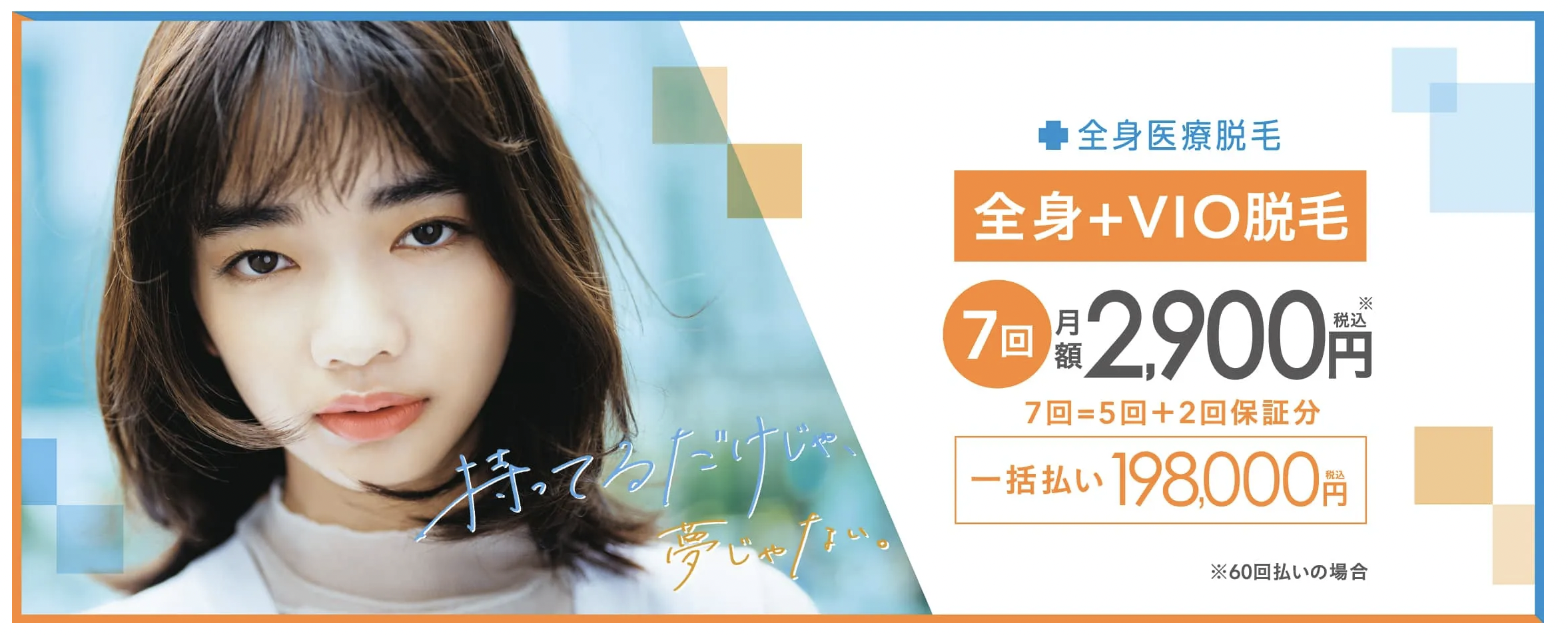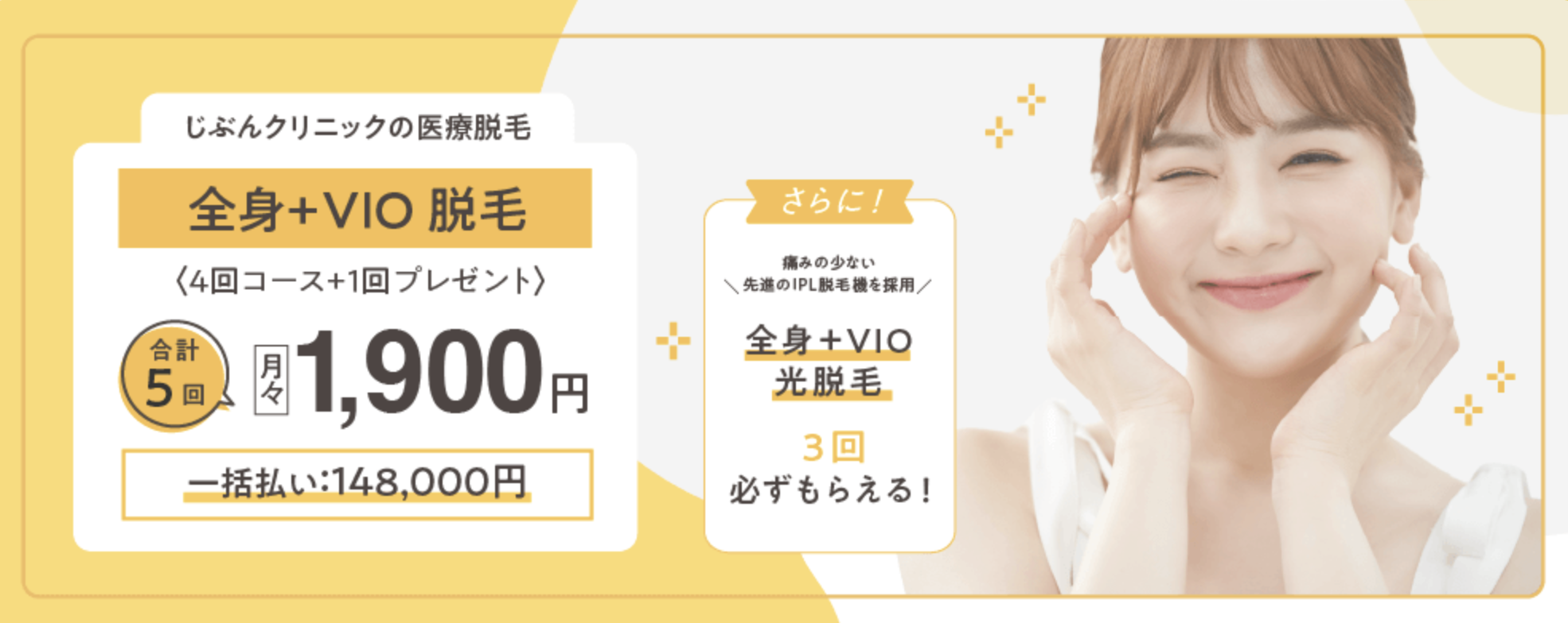 | 全身脱毛5回身 | 総額198,000円 月々2,900円60回払い プラス2回分保証! ※VIOつき |
