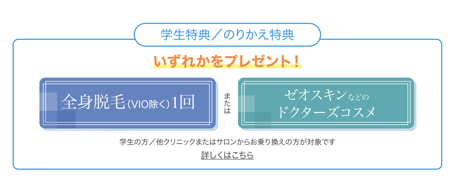| 割引の有無 | 学生特典・乗り換え特典 全身脱毛1回かドクターズコスメをプレゼント |
