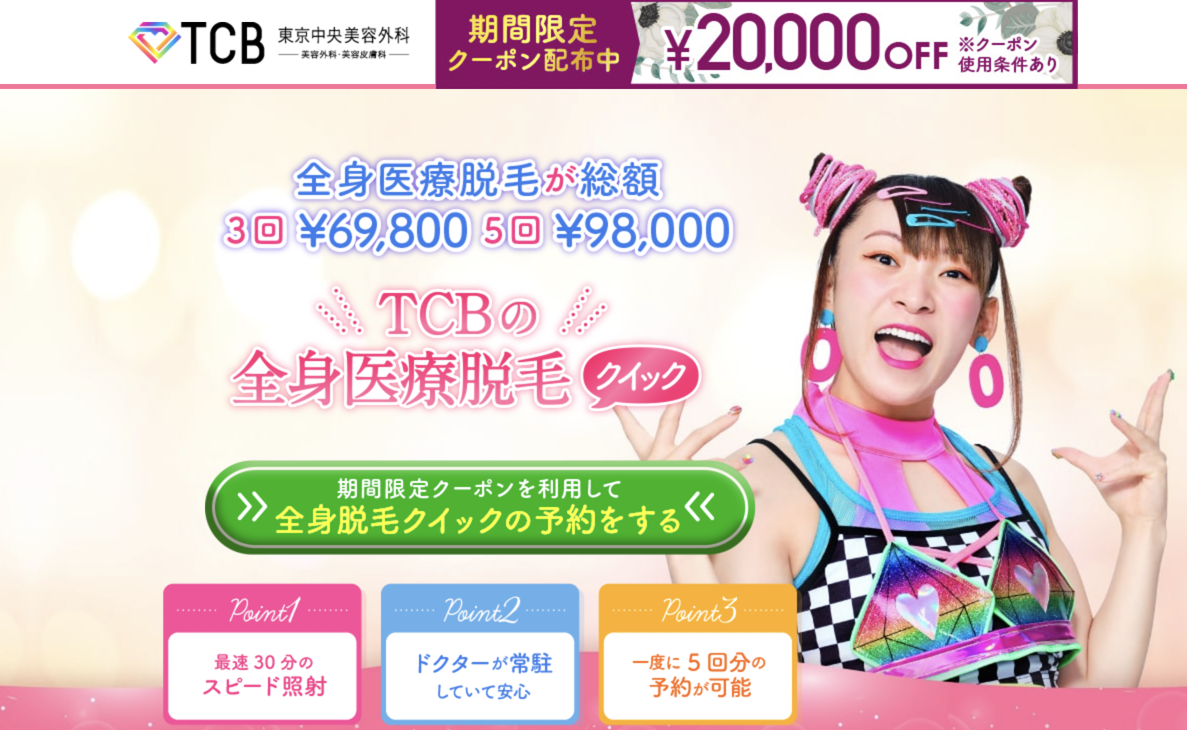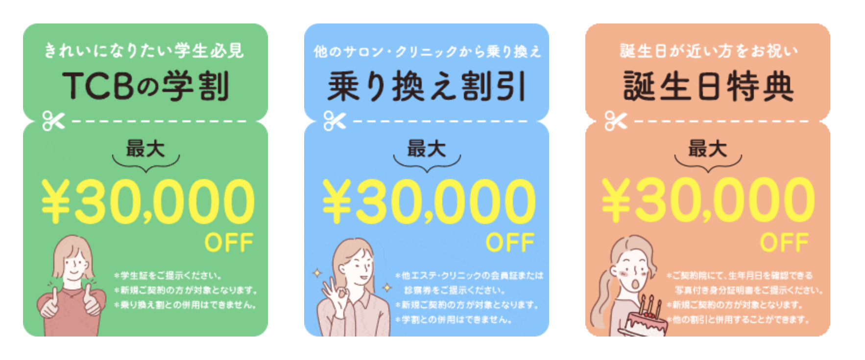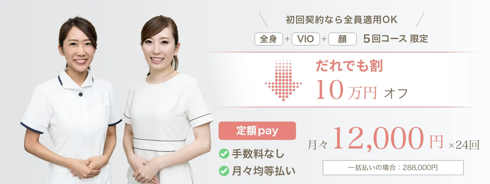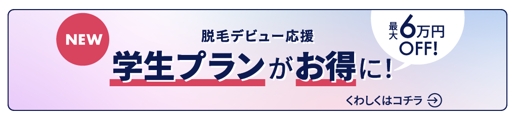 学割20%オフ 乗り換え割り・ペア割り10%オフ 全身脱毛5回コースで10万円割 |