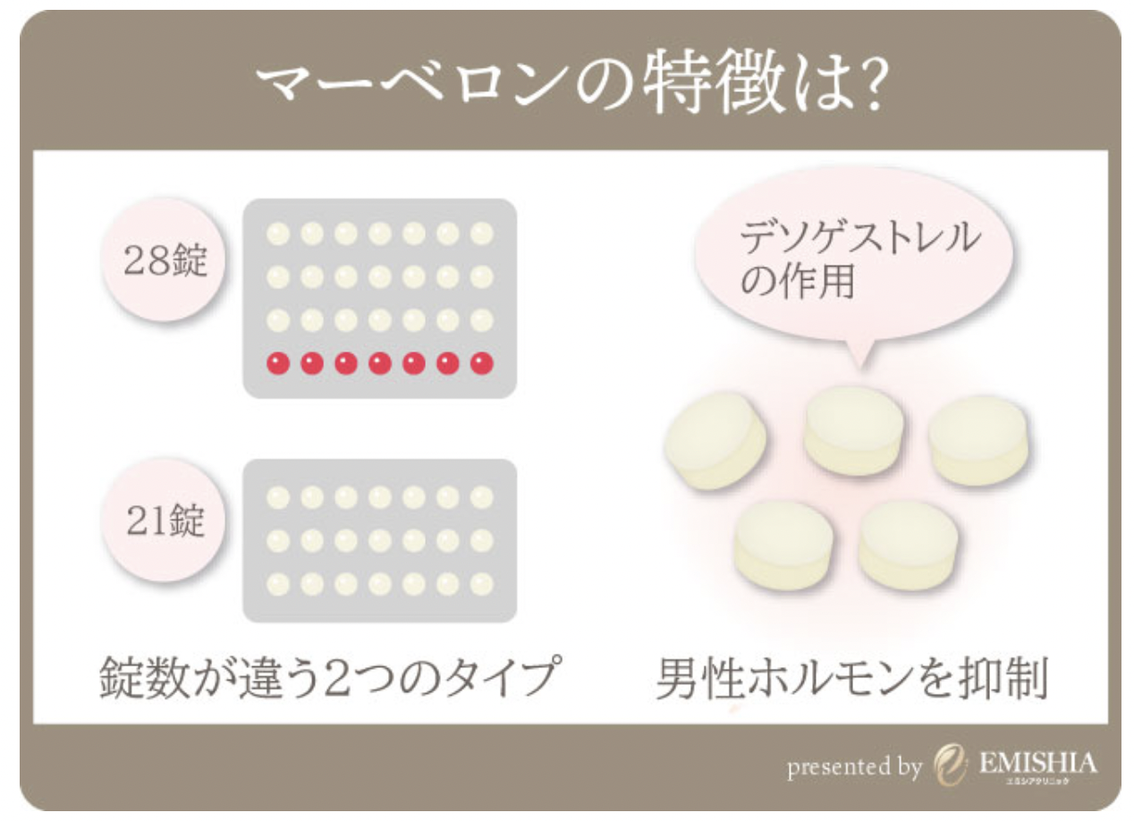 マーベロンは、低用量ピルの一種で黄体ホルモン「デソゲストレル」を配合している第3世代のピルに区分されます。第3世代は、他のピルと比べると男性ホルモンを抑えられるピルです。