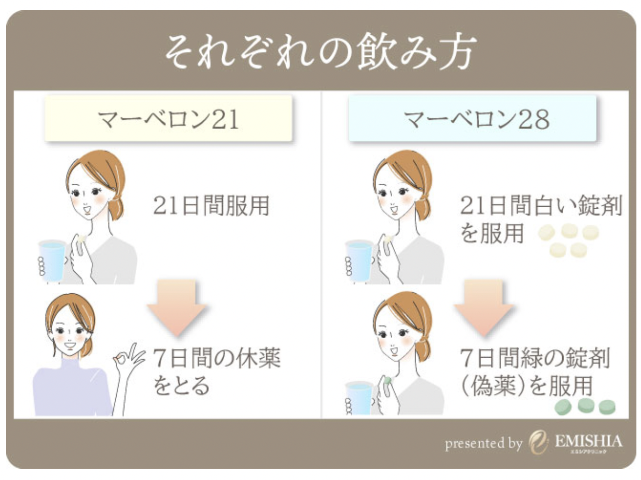 - マーベロン28:21錠の実薬と7錠のホルモン成分が含まれていない偽薬(=プラセボ)で構成されている。偽薬は、休薬期間に飲むもので飲み忘れや飲み間違いを防いでくれます。