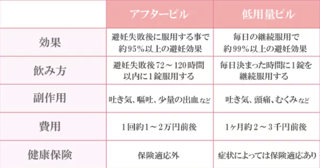 アフターピルと低用量ピルとの違いは、まず避妊する服用タイミングの違いです。アフターピルは避妊を失敗してしまった性行為後に服用する事で避妊を成功させます。それに対して、低用量ピルは毎日服用する事で避妊する効果のあるお薬になります