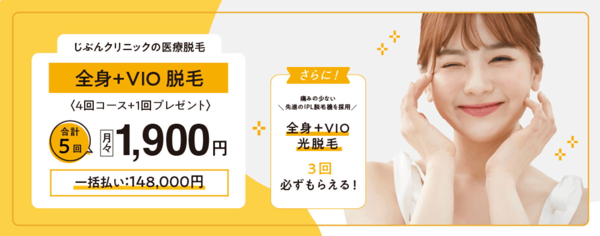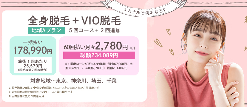 | 全身脱毛+VIO+顔・6回(税込) | 244,000円〜 |