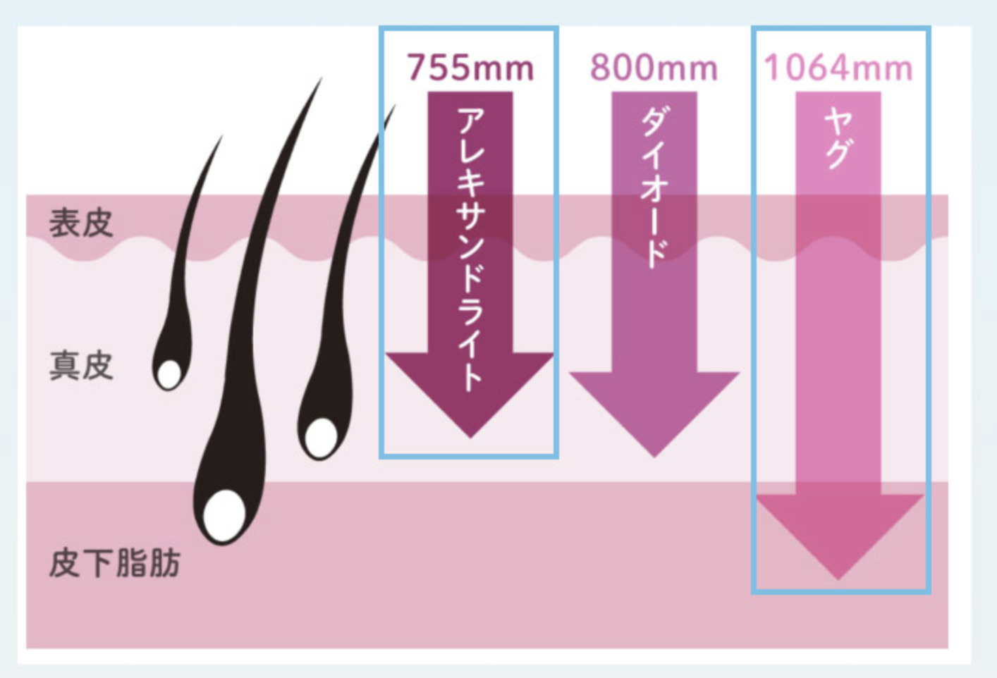 アレキサンドライトレーザーの波長は、ダイオードレーザーとYAGレーザーに比べると短い755nmです。