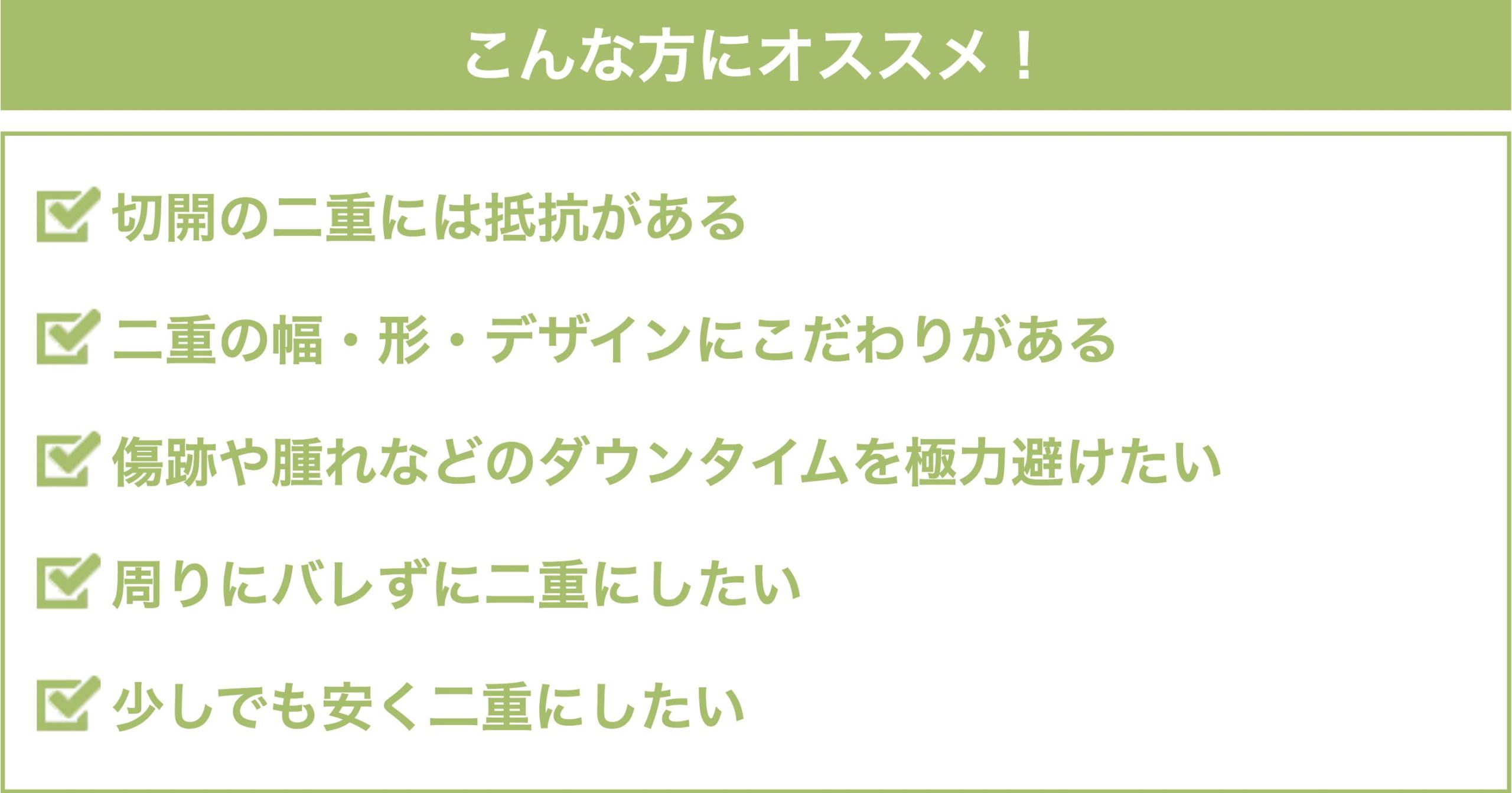 東京中央美容外科のシークレットオプションは、周囲にバレたくない方にオススメのオプションです。まぶたの皮膚表面に傷を付けないため、目を閉じたときに結び目などが目立たず、ナチュラルな二重になります。