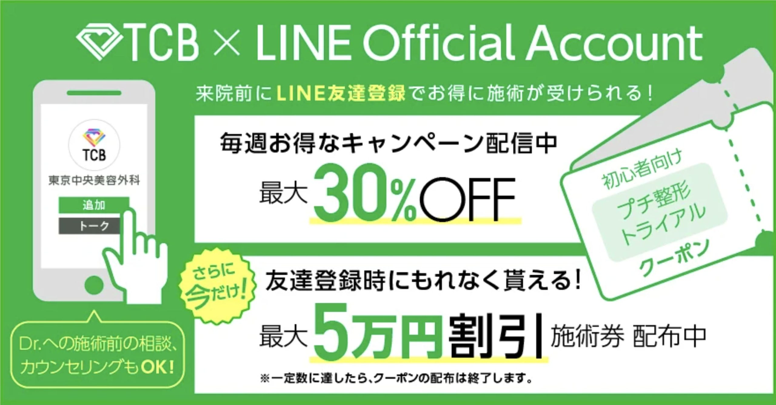 東京中央美容外科の公式LINE登録でお得なクーポンがGETできます。期間限定の20,000円OFFや50,000円OFFクーポン、毎週最大30%OFFキャンペーン情報等が配信されます。