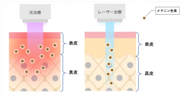 光治療とレーザー治療はどちらもニキビ跡の原因に直接働きかけることができる治療です。光治療は浅く広い層に、レーザー治療は深く狙った1点にパワーを届けます。