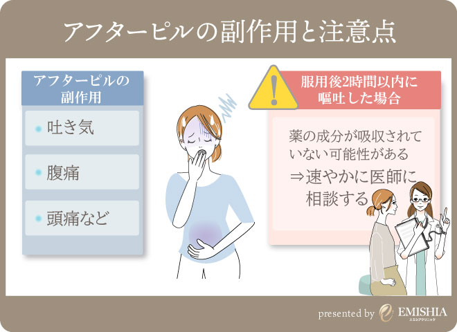 アフターピルを服用したときの副作用には、腹痛や頭痛、吐き気などがあります。吐き気止めと一緒に処方される場合もありますが、アフターピルを服用後2時間以内に吐いてしまった場合は、薬が吸収されていないことも考えられるためすぐに医師に相談しましょう。