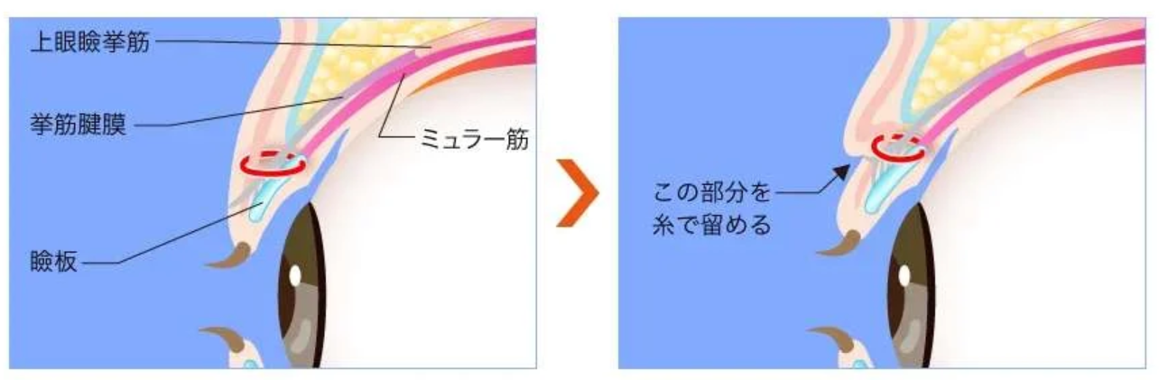 まぶたを引き上げる時に使われる眼瞼挙筋(がんけんきょきん)という筋肉に糸を通して結び付け、二重を形成する手術方法です。眼瞼挙筋は柔らかい筋肉組織です。