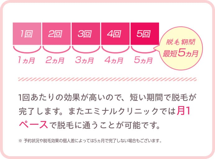 一般的な医療脱毛クリニックは2〜3ヶ月に1回施術を行うので、5回施術を行うのに1年近くかかります。
