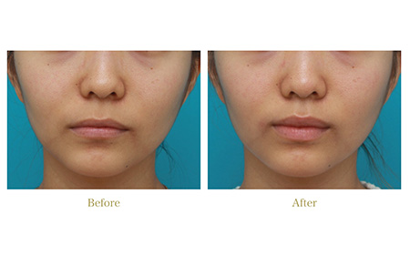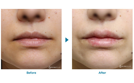 症例写真を見るとわかるように、ビフォーでは薄い唇であったり口角が下がっていることがわかります。唇の形によっては、怒っているかのような怖い印象を与えることもありますが、アフターの症例写真を見てみると、唇がぷっくらとした印象になるのがわかります。