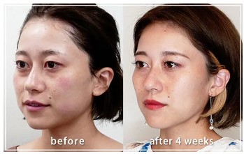 リスク・副作用:注入部位に内出血が生じる場合があります。ファンデーションで隠すことが可能です。効きすぎると、まれに顎の筋肉が動かしづらくなり、表情がこわばったように見える場合があります。時間の経過とともに回復します。