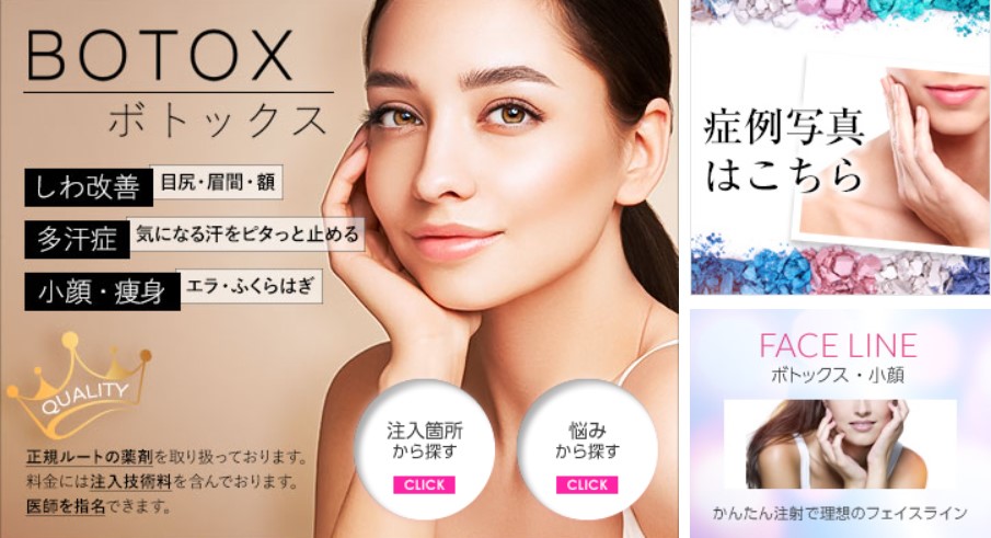 | 特徴 | ボトックスの種類が豊富 | 全国72院展開で近場施術 | 高い知識と技術があるドクター | 対応できる悩みが多い | オーダーメイドの治療を提案 |